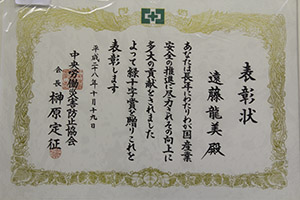 今年度の緑十字賞という栄えある賞を当協会の遠藤龍美労務委員長が受賞されました。緑十字賞は産業安全や労働衛生の推進とその業務に多年にわたり従事し、その業績が顕著で他の模範となる功績のある方が受賞される名誉ある賞です。