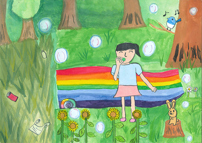 【銅賞】 溝口莉紗 さま (三柏株式会社) 画題「にじのじゅうたんとしゃぼんだまでピッカピカ」 |