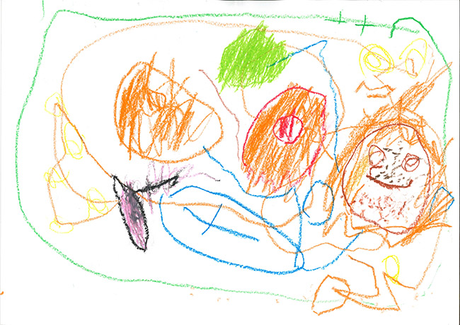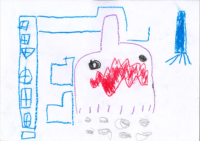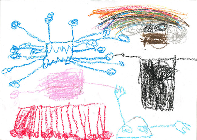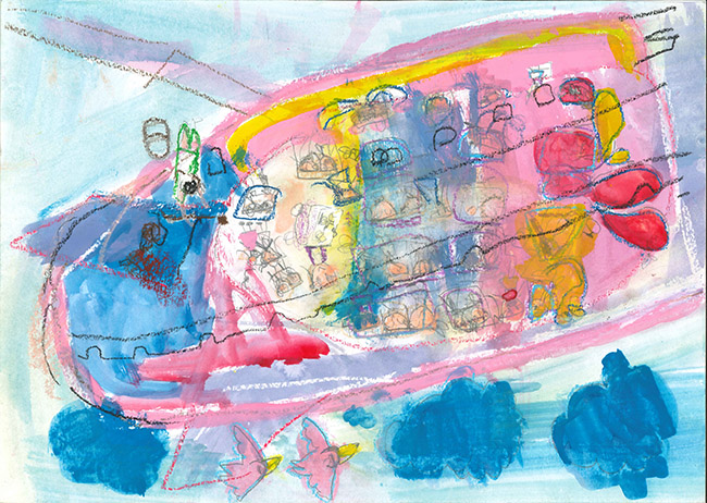 【銅賞】 かたおかけいご さま (合歓の木幼稚園) 画題「UFOにのったうちゅうじんがそうじするよ」 |