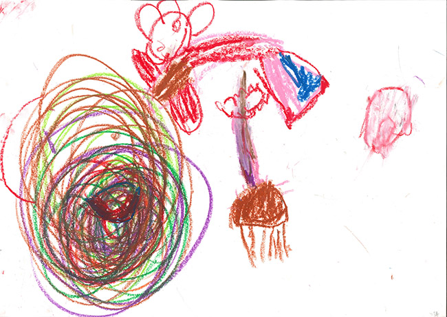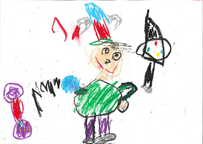 【銅賞】 むらせゆうが さま (うぬま第一幼稚園) 画題「くるくる空飛ぶほうきマン」 |