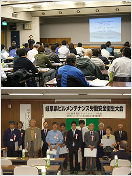 毎年労働安全大会を実施し実践発表、安全衛生講演会、無災害記録認定証の授与、安全衛生標語の募集と優秀作品の表彰を行いビルメンテナンス経営者や従事者の教育を行っています。